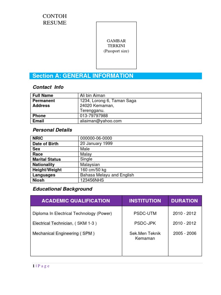 Resume Lengkap Untuk Memohon Kerja Pelajar Latihan Industri